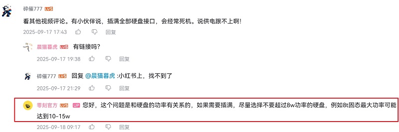 后来我在bilibili的零刻官方账号下面,有人反馈me mini这个机器在装了6块硬盘以后会供电不足掉盘,零刻官方的回复是【单盘功耗不要超过8w】。